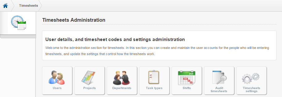 The Timesheets administration page is where timesheet users, projects, work shifts and task types are maintained. Task types and shifts can be marked as 'default'.